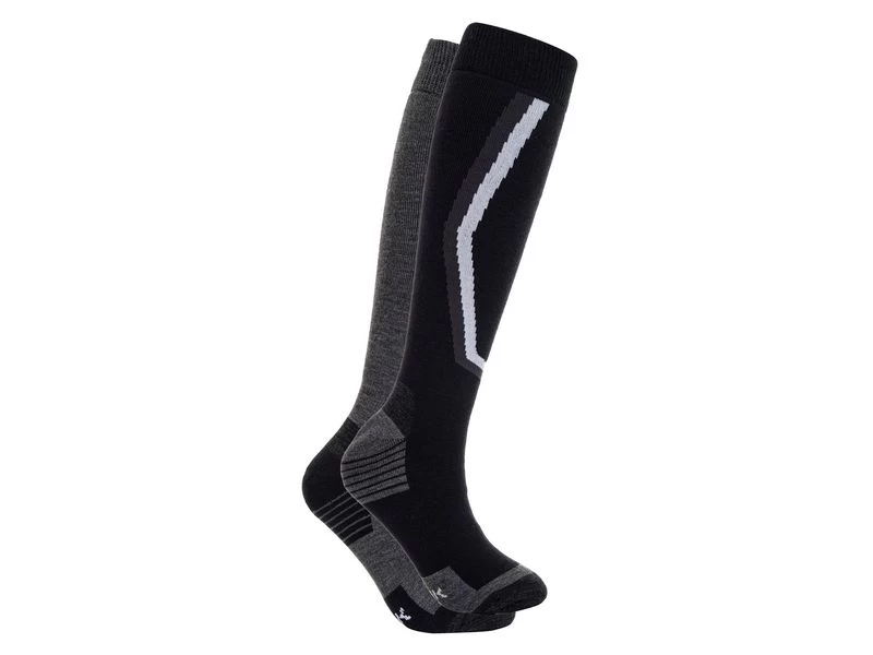 Prettige sokken voor ski/snowboard. Deze sokken zijn speciaal ontworpen om je voeten comfortabeler te laten voelen in ski en snowboard schoenen. De sok heeft zachte stukken bij de zool, tenen en enkel. De versteviging geeft extra ondersteuning rond de enkel- en voetboog. De sok is gemaakt van een verfijnde mix aan materialen met MERINO wol. De uitzonderlijk zachte , niet jeukende merinowol zorgt voor warmte in de kou, zelfs als het nat is.