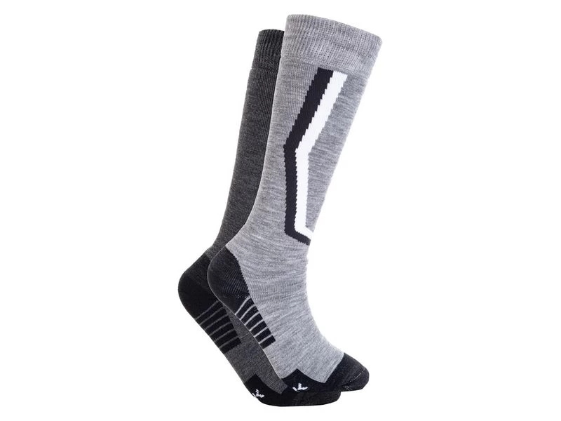 Heerlijke sokken voor ski/snowboard. Deze sokken zijn speciaal ontworpen om je voeten comfortabeler te laten voelen in ski en snowboard schoenen. De sok heeft zachte stukken bij de zool, tenen en enkel. De versteviging geeft extra ondersteuning rond de enkel- en voetboog. De sok is gemaakt van een verfijnde mix aan materialen met MERINO wol. De uitzonderlijk zachte , niet jeukende merinowol zorgt voor warmte in de kou, zelfs als het nat is.